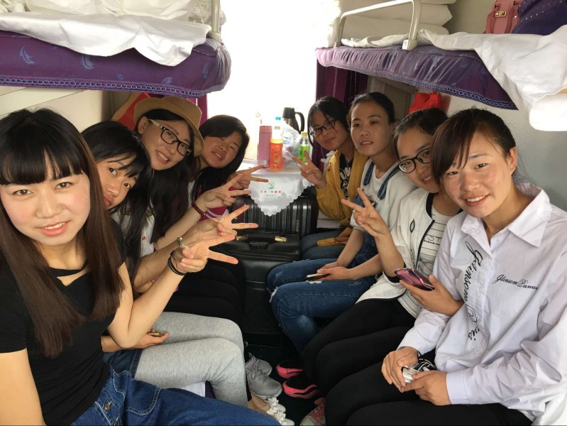在去敦煌的火车上,外国语言文学系党总支书记周海燕老师向本次实习的23名2013级同学再次强调了本次实习的重要性和实习的目的,希望同学们以认真的态度完成本次实习工作,并要求同学们一定要在实习期间严格要求自己,遵守实习单位和学校的纪律。到实习单位后要求同学们以外语学子的风采去积极应对实习中的困难和挑战以便尽快适应实习单位,同时也能为自己真正踏入社会打下坚定的基础。2013级班主任蔡婧婧老师和同学们分享了上届学生实习的工作经验,提出本次文博会实习机会不易,希望实习生能够用自己的决心、勤恳、认真、努力去完成实习工作。她鼓励同学们要在实习中展现出自己勇敢自信的一面,同时她祝愿本次文博会实习工作能取得圆满成功。最后,两位老师与我系文博会实习生在欢声笑语中结束了本次敦煌实习欢送的旅程。