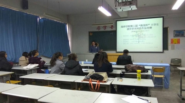 随着高校改革的转型发展,“大众创业,万众创新”已成为新常态下大学生进去社会职场的主旋律,高校鼓励大学生创业,不仅有利于拓宽大学生就业门路,创造更多的就业岗位,而且有利于实现大学生的个人价值。在社会形成创新创业的氛围下,为响应我院“挑战杯”大学生课外学术科技作品竞赛。2016年11学21日下午4点半,我系老师和学生在509教室举行系级初赛,参赛评委有外国语言文学系主任权志成、党总支书记周海燕、教学副主任陈小玲。