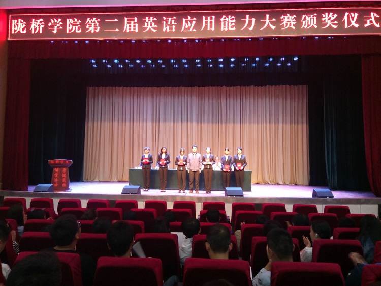 5月31日下午,陇桥学院第二届英语应用能力大赛(翻译、听力、朗诵类)颁奖仪式在学术报告厅举行。学院领导郇东、高军、燕宏同志,督导组副组长杨怀有同志及外国语言文学系领导班子出席颁奖仪式。仪式由外国语言文学系主任权志成主持。大赛指导老师及800名学生参加了表彰仪式。