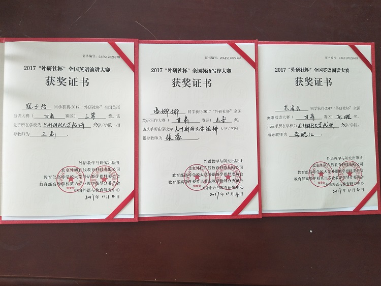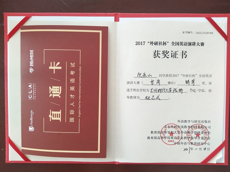 11月4日,2017“外研社杯”全国英语演讲、写作、阅读比赛(甘肃赛区复赛)在兰州文理学院落下帷幕。来自全省21所高校的119名选手参加了比赛,我院4名学生分别参加了三项赛事并获得非常优异的成绩。2014级学生张岳山以甘肃赛区第三名的成绩荣获演讲大赛特等奖;2015级学生寇子怡获得演讲大赛三等奖;2014级学生冯娜娜获得写作大赛三等奖;2016级学生苏海云获得阅读大赛优胜奖。张岳山同学获赠北京外国语大学中国外语测评中心颁发的国际人才英语考试直通卡,可免费参加“国际人才英语考试”考试一次。12月初,张岳山同学将代表甘肃赛区参加在北京举办的“外研社杯”全国英语演讲大赛总决赛。