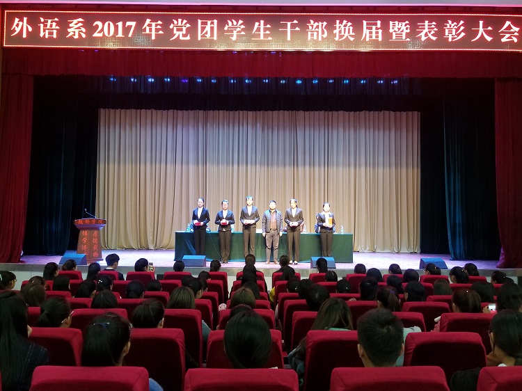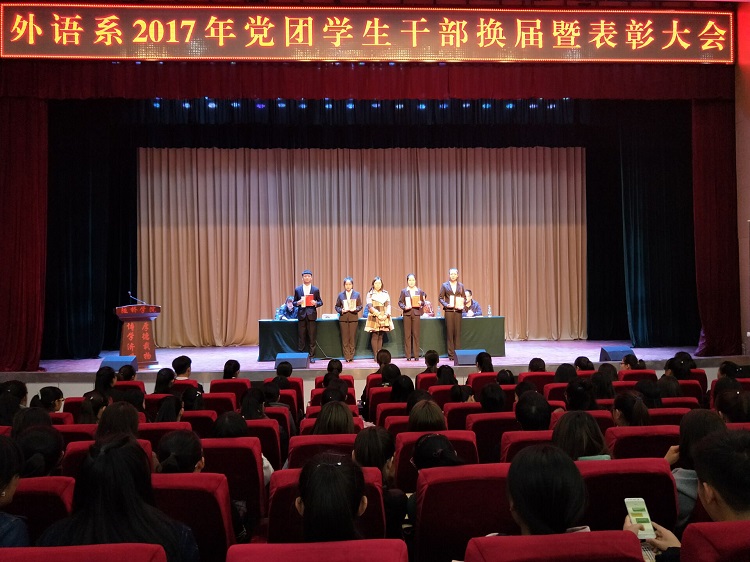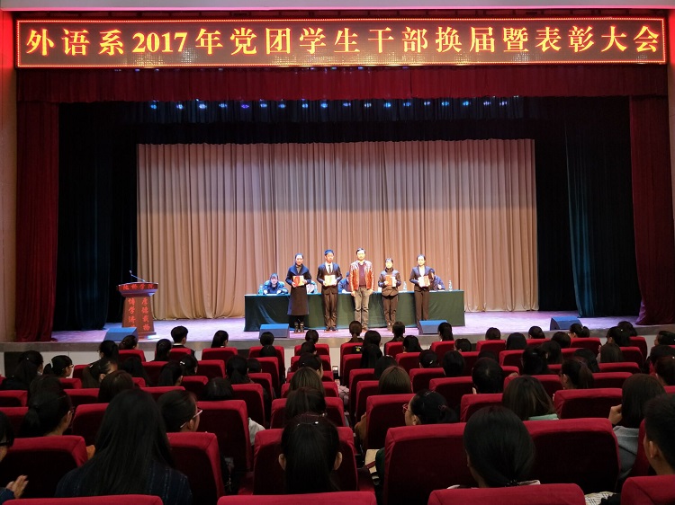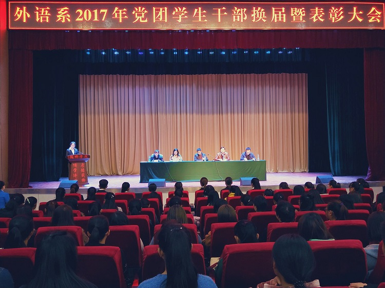 20171110日下午, 外国语言文学系在学术报告厅召开2017年度党团学生干部换届暨表彰大会。出席大会的领导有外国语言文学系主任权志成、党总支书记杨鹏、副主任韩世霞、党政秘书张文魁。会议由团总支书记蔡婧婧主持。