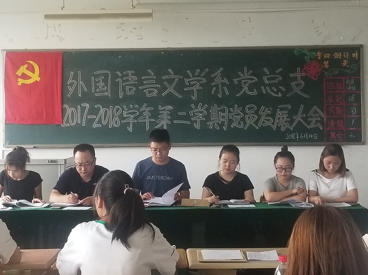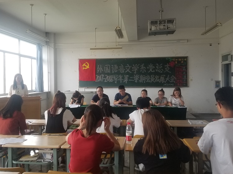 6月15日16:30,外国语言文学系学生党支部在4-509教室召开了本学期党员发展大会。系党总支副书记陈建平,党政秘书、学生第一支部书记张文魁,团总支书记、学生第二党支部书记蔡婧婧以及全体学生党员参加了会议。