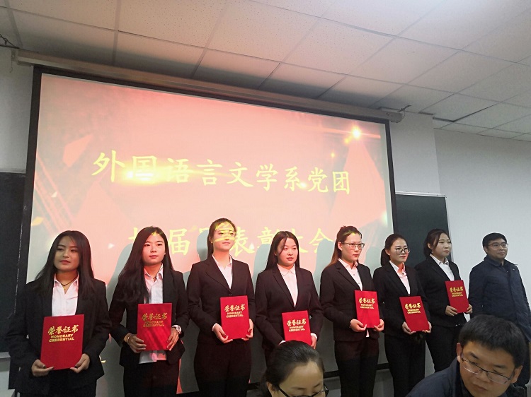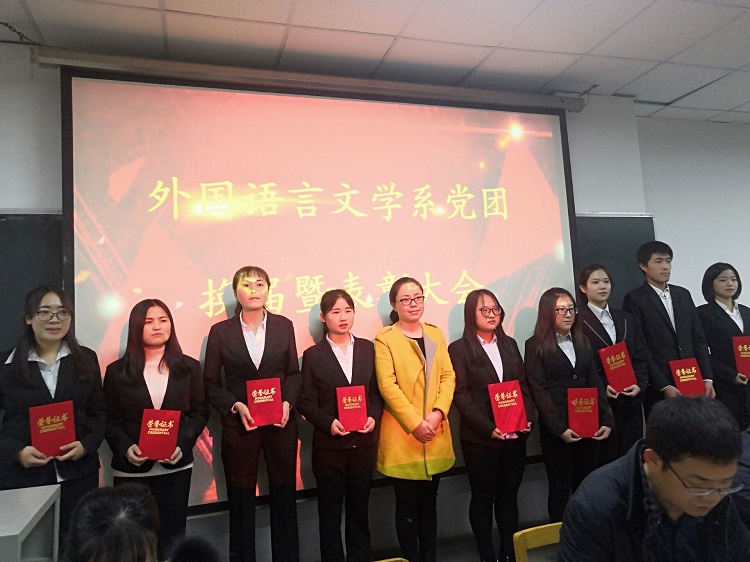 11月23日下午4:30,外国语言文学系党团组织换届暨表彰大会在博学楼215教室召开,系领导班子成员、全体辅导员、学生干部代表共计180余人参加了本次会议,会议由团总支书记蔡婧婧老师主持。