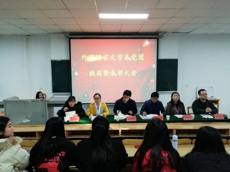 11月23日下午4:30,外国语言文学系党团组织换届暨表彰大会在博学楼215教室召开,系领导班子成员、全体辅导员、学生干部代表共计180余人参加了本次会议,会议由团总支书记蔡婧婧老师主持。