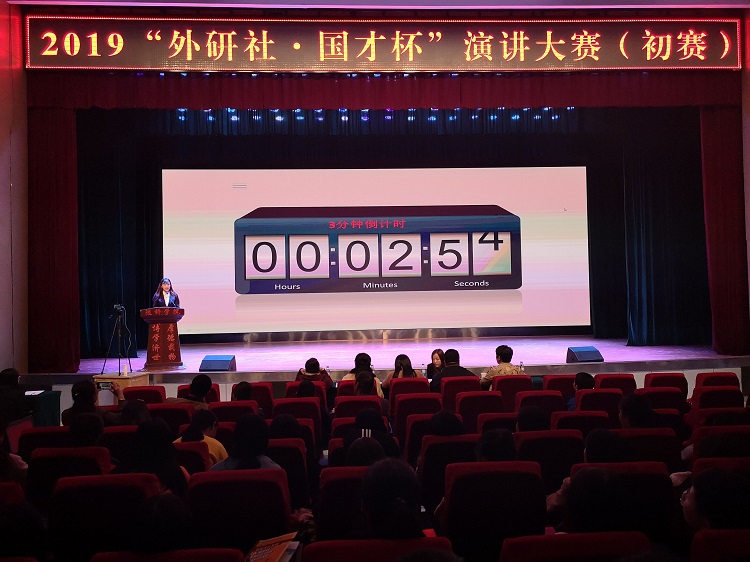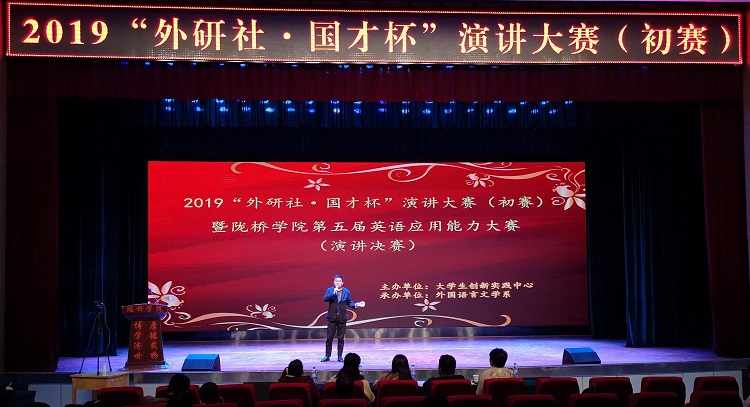 10月13日19:00,演讲决赛在学术厅准时开赛。本次大赛与2019年“外研社·国才杯”英语演讲大赛选拔赛同步举行。学院团委书记康思忆、教学总监李银仓、外国语言文学系主任权志成、党总支副书记陈建平、教学副主任韩世霞等领导及部分教师应邀出席观看比赛。本次演讲决赛分专业组和非专业组,共十四名选手,演讲主题为” My Big Story in 2049”。比赛分为命题演讲、即兴演讲和回答问题三个环节。命题演讲环节中,选手们就主题阐述自己的观点,选手们仪态得体、口语流利、自信阳光,赢来阵阵掌声。在即兴演讲和回答问题环节中,评委根据定题演讲内容提问,选手根据问题现场用英语作答,选手们反应敏捷,作答紧扣话题,台风自然得体,并能结合生活、学习中的事例来论证自己的观点。