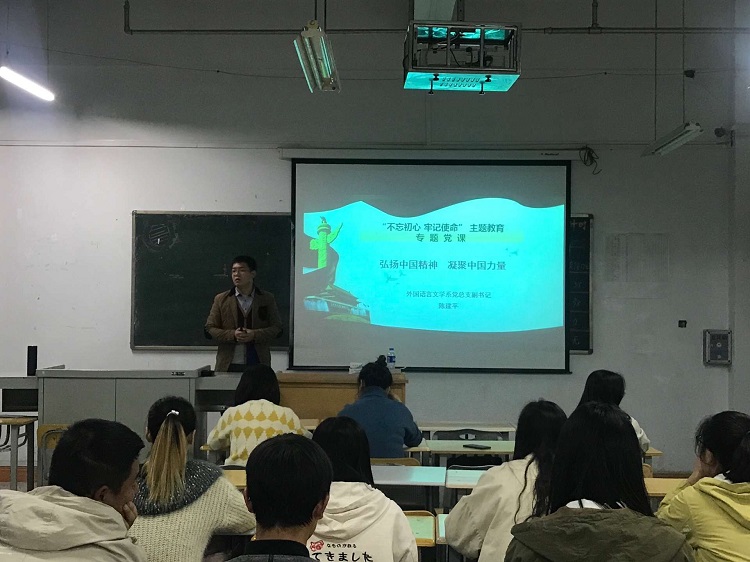 按照学院党委《关于在“不忘初心、牢记使命”主题教育中加强爱国主义教育、弘扬爱国主义精神的通知》(陇桥党发[2019]97号)文件要求,我系党总支副书记陈建平于10月29日晚为全系学生党员、第60期入党积极分子做了题为“弘扬中国精神,凝聚中国力量”的专题党课。