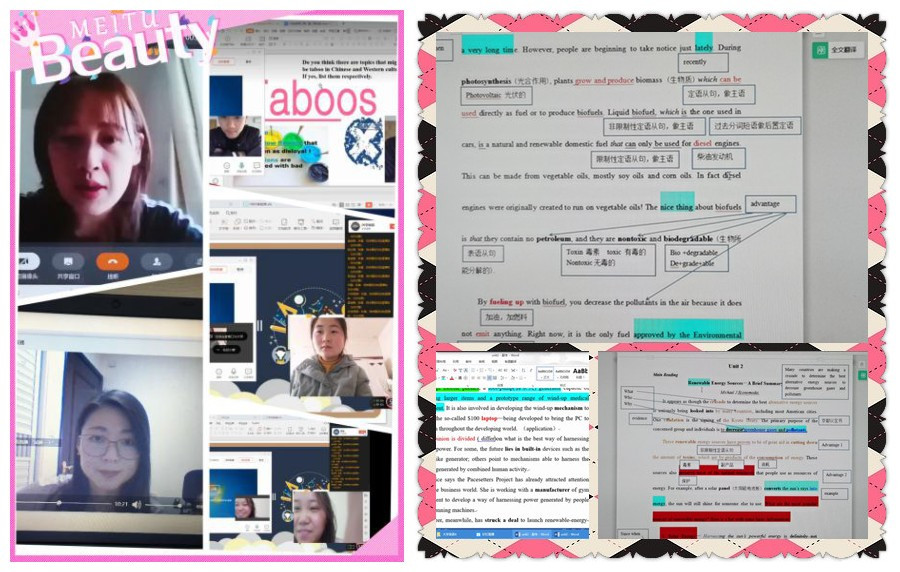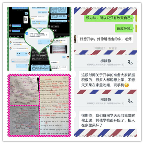 漫长的假期,学生待在家里却深深想念学校的一切。他们渴望开学,渴望上课,渴望学习。当听到学院开展线上教学的通知,很多学生向老师表示自己想要上课的迫切渴望。线上教学作为一种新型教育方式,对于老师和学生都是一种崭新且新奇的体验。于同学们而言,线上教学实现了随时随地学习,提升了学习的自由度,也增加了学习乐趣。但线上学习模式缺乏教室里一起学习的氛围且不容易集中注意力,极大考验了同学们的自控能力。经过这一段时间的线上学习,学生们更加明白了自主学习的重要性。如何从假期的倦怠与轻松感走出来,跳出舒适圈,成为了他们提高自律能力的关键。学生深深理解学院和老师开展线上教学的辛苦,学习刻苦勤奋。有的学生因没有教材,就一个单词一个单词把教材抄下来,没有一个学生因为没有教材而掉队。仅靠线上堂课还远远不够,线下师生互动频繁,咨询问题,请教学习方法,学生们敢想敢问,老师细致解答,学习的热情绝不输于线下课堂教学。尤其是2017级和2018级学生,他们积极备考专业英语四级。师生合作,力争上游,利用一切可以利用的资源,努力提升自我。在学习的路上,同学们丝毫不敢松懈。