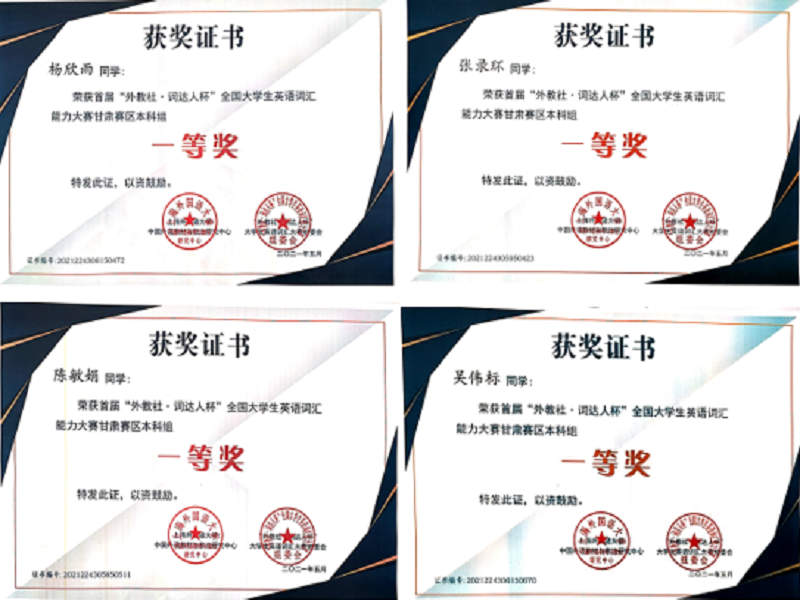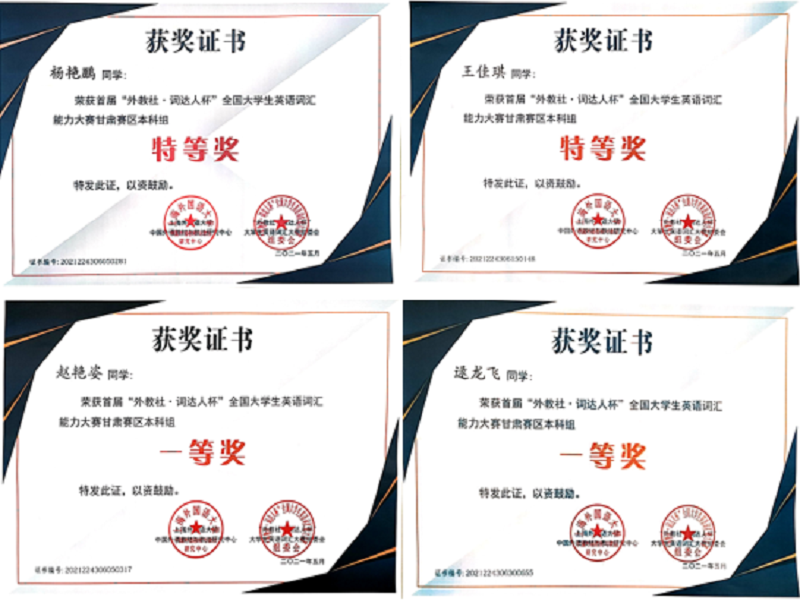根据《首届“外教社·词达人杯”全国大学生英语词汇能力大赛西北赛区通知》,5月27日,我院成功举办“外教社·词达人杯”大学生英语词汇大赛,共有3186名学生参加大赛。其中,王佳琪和杨艳鹏2名同学获得省赛特等奖,赵艳姿等6名同学获省赛一等奖。同时,经全国大赛组委会评选,我校荣获优秀组织奖,阮晓静等8名老师获得优秀指导教师奖。
