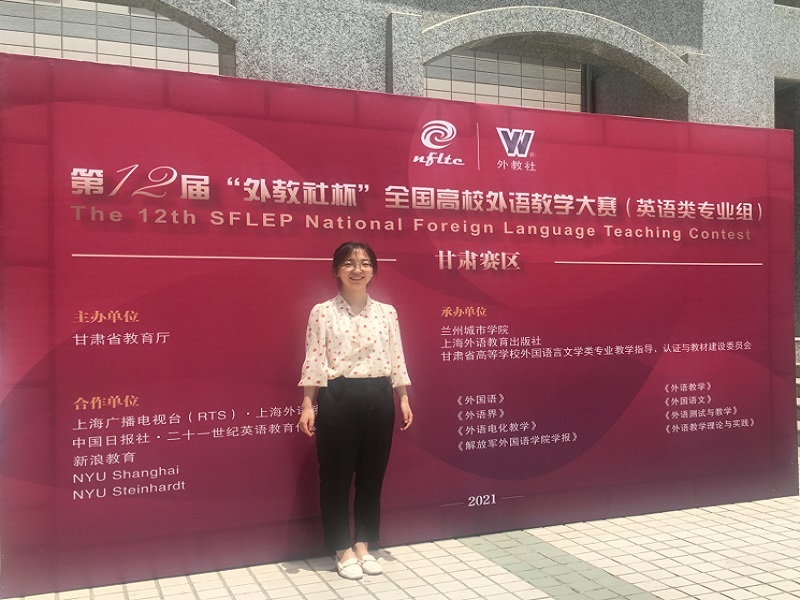 近日,第十二届“外教社杯”全国高校外语教学大赛(英语专业组)甘肃赛区比赛在兰州城市学院成功举办。本次比赛由甘肃省教育厅主办,兰州城市学院承办。比赛分为英语专业组和商务英语专业组两个组别,来自20所本科院校的39位选手参加比赛。经过激烈角逐,我院张蓉老师荣获“英语专业组”三等奖,靳亚博老师荣获“商务英语专业组”三等奖。