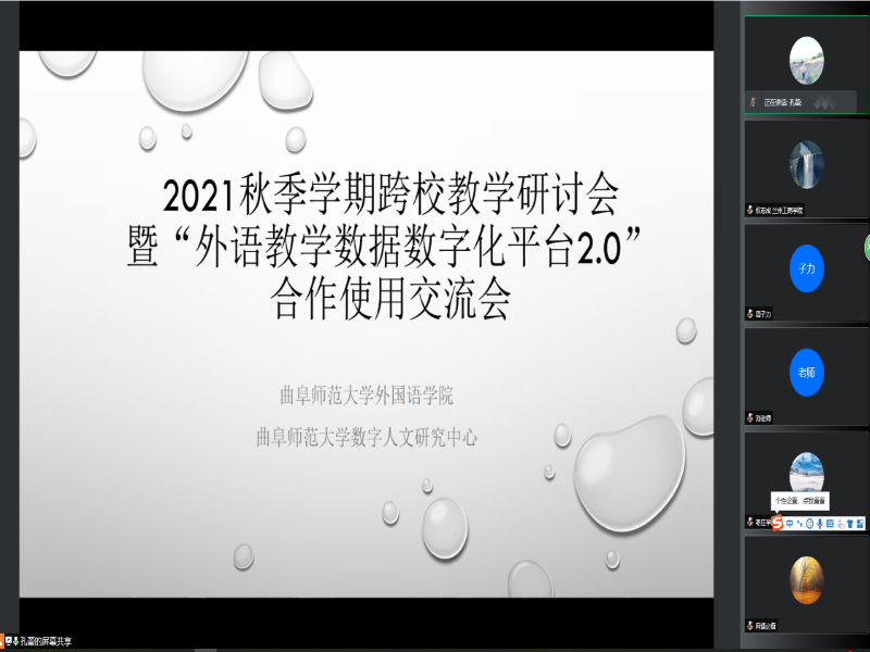 2021年8月25日下午,外语学院领导班子及部分教师代表参加了2021秋季学期跨校教学研讨会暨“外语教学数据数字化平台2.0”合作使用交流会。会议由曲阜师范大学外国语学院和曲阜师范大学数字人文研究中心召集,兰州工商学院、山东农业大学、烟台大学、枣庄学院、菏泽学院、潍坊学院、山东外国语职业技术大学、临沂大学8所高校外国语学院学科负责人和任课教师近60人参加会议。