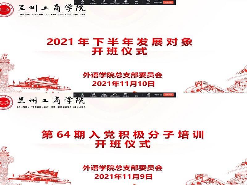 11月9日和11月10日晚上,外语学院通过钉钉会议举行第64期入党积极分子及2021年下半年发展对象培训班开班典礼。外语学院党总支副书记陈建平、团总支书记张文魁、党政秘书汪敏荣出席了典礼,党务干部、全体2021年下半年发展对象和第64期入党积极分子参加了典礼,典礼由张文魁主持。