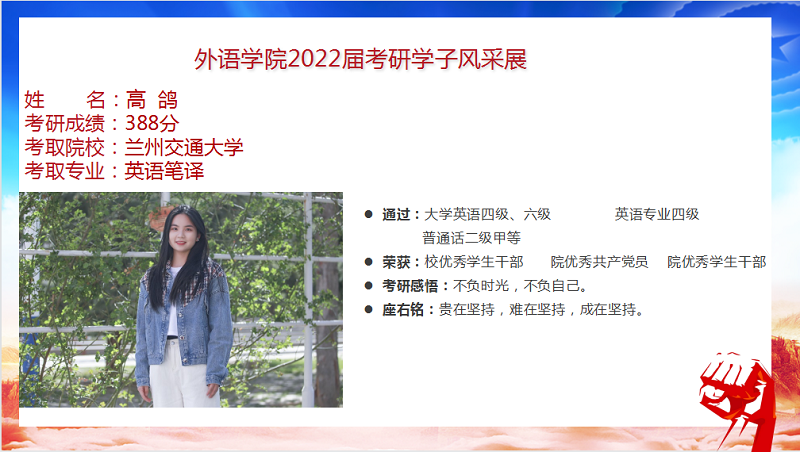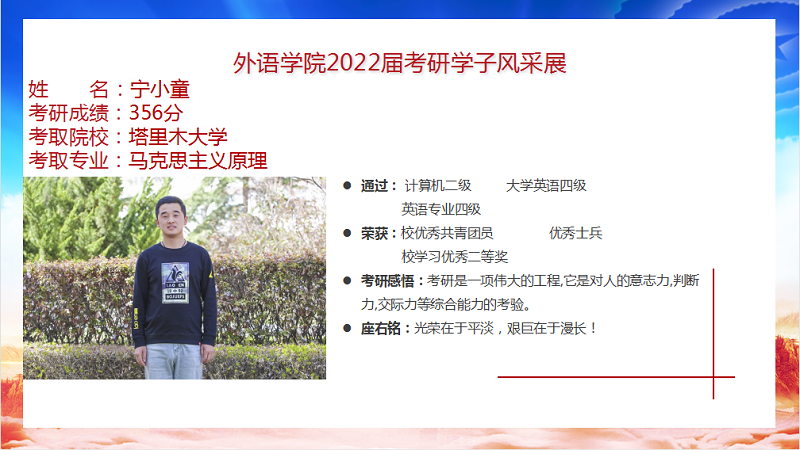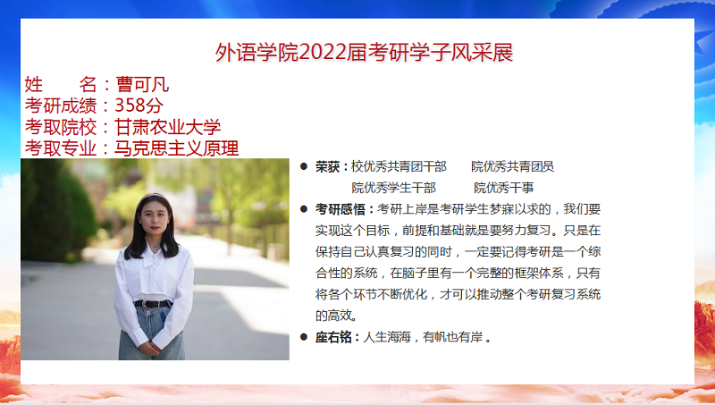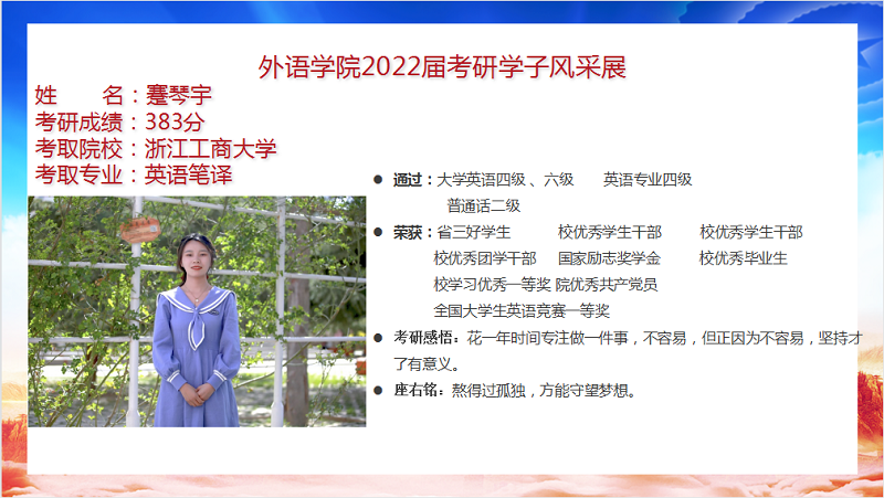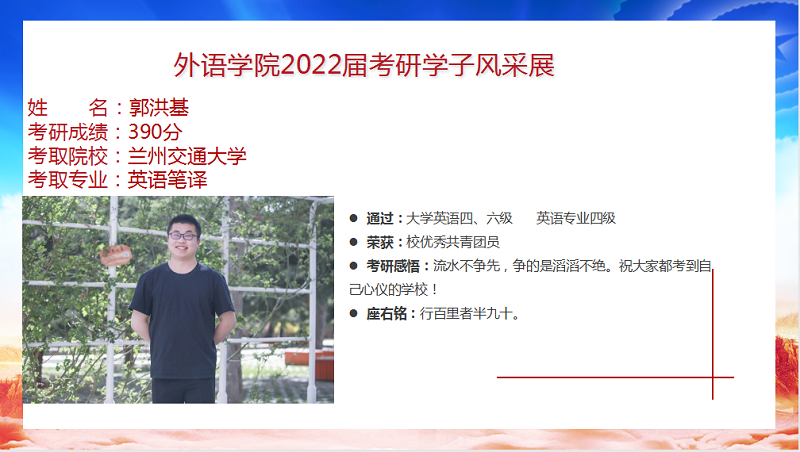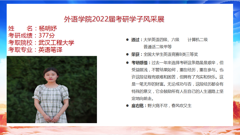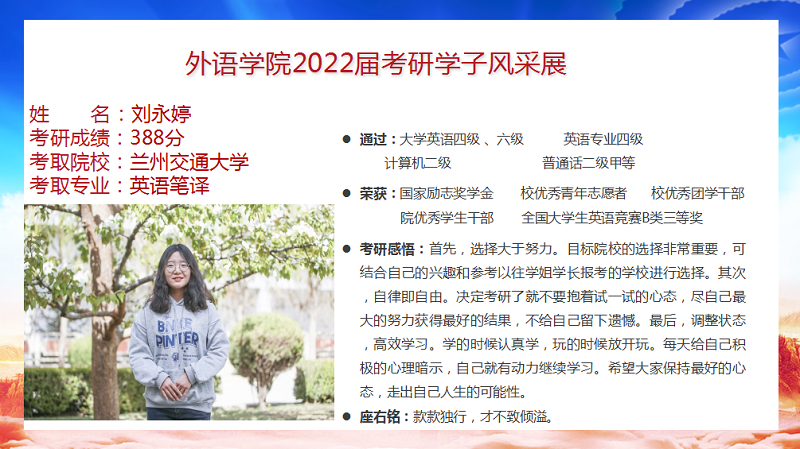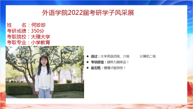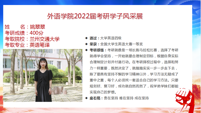 我院2022届毕业生共88人,9人考取研究生,录取率为10.2%,连续三年位列全校前列。考研报名率、上线率、录取率均创新高。