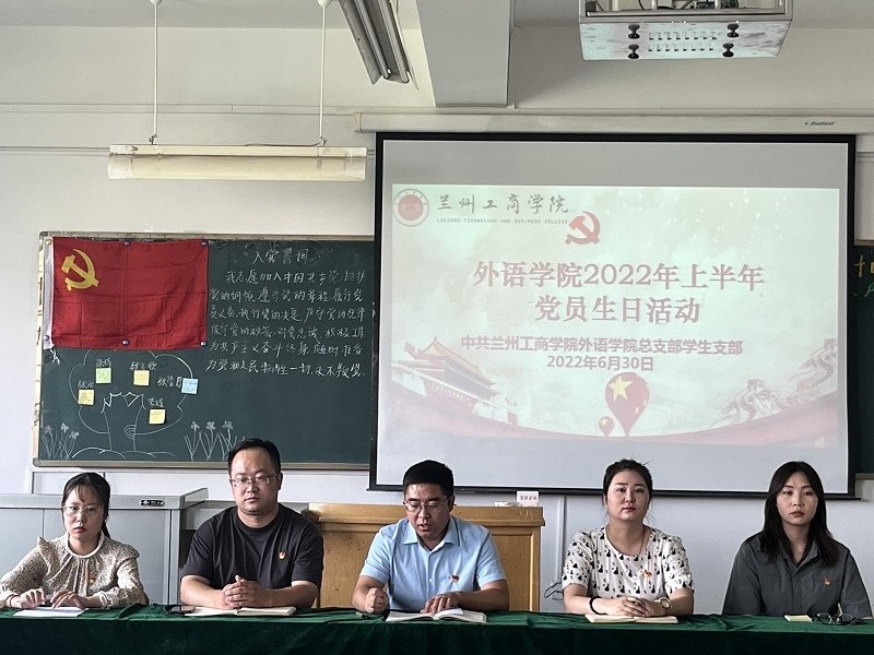 为深入学习贯彻习近平新时代中国特色社会主义思想,持续推进党史学习教育常态化、长效化,强化党员的身份意识和责任意识,根据《中共兰州工商学院委员会关于开展“党员政治生日”活动实施方案》的通知》要求,我院于6月30日在4号教学楼509教室举办了2022年上半年外语学院党员“政治生日”主题党日活动。外语学院院长权志成同志,外语学院团总支书记张文魁同志、外语学院党政秘书兼学生支部书记汪敏荣同志、外语学院学生党支部副书记刘璐同志及外语学院学生党支部全体党员同志参加了本次活动。