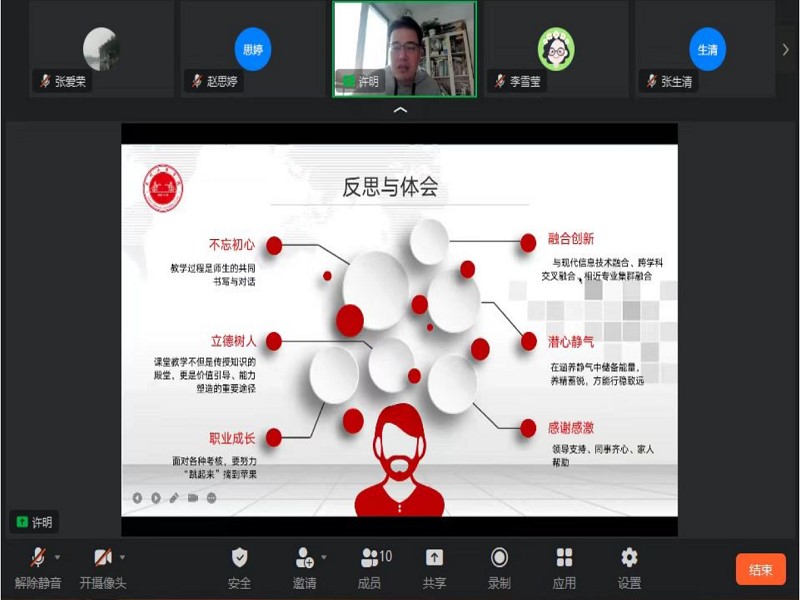 3月5日下午,兰州工商学院外语学院大学英语第三教研室,通过钉钉平台,线上组织教师召开本学期第一次教研室会议。会议邀请了财政金融学院许明老师作经验分享,大学英语第三教研室全体成员参会,会议由张爱荣主任主持。