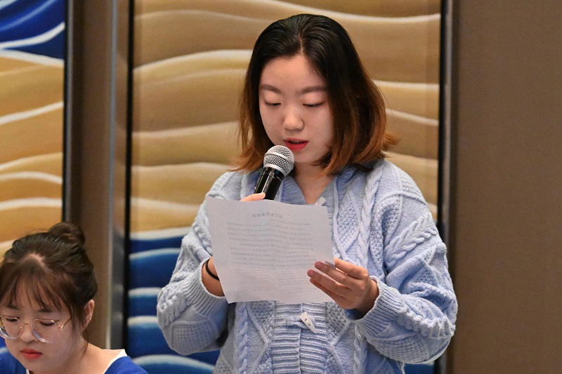 会议伊始,双方介绍了参会人员,由皇冠假日酒店人事经理马英、西餐厅经理郑海宽、总工程师王小兵分别介绍了实习生的工作情况,三位领导均对外语学院实习学生给予了高度评价,表示外语学院学生认真细致、尽职尽责,是公司带过最好的实习团队之一。随后,实习生代表牟娜及8月份优秀实习生康博音分享了实习感悟,表达了在实习岗位上实践出真知的磨练和开拓视野、增长才干的收获。