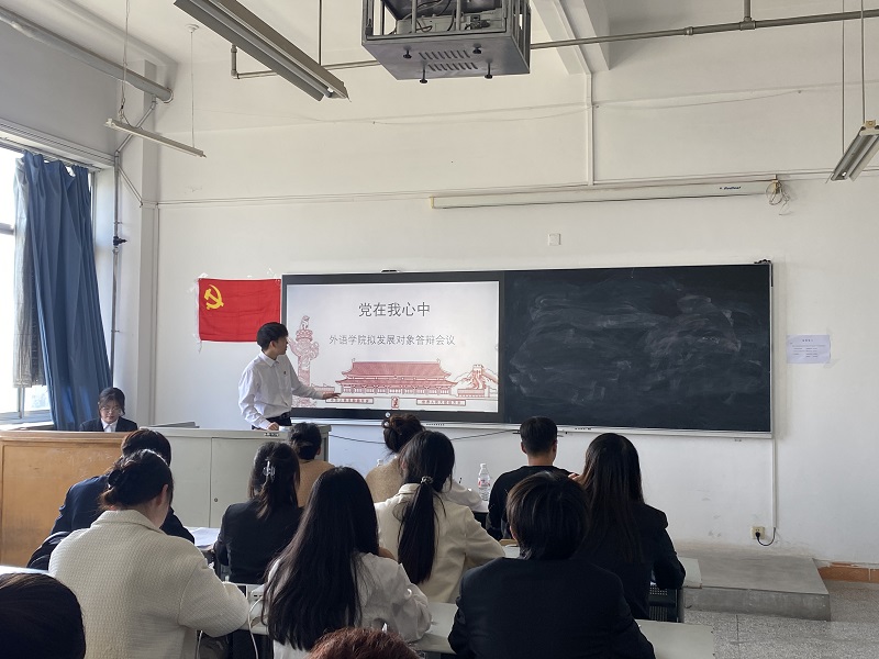 为进一步加强和改进发展学生党员工作,把牢学生党员发展的“入口关”,切实保证新发展党员质量,根据《中国共产党章程》和《中国共产党发展党员工作细则》和学校党委相关文件要求,结合我院党总支工作实际,1016日在4号教学楼609在召开外语学院党总支拟发展对象公开答辩会议,出席本次大会的领导有外语学院党总支书记张钰同志、外语学院学生党支部书记兼党政秘书滕婧茹同志、外语学院团总支书记田煜同志。