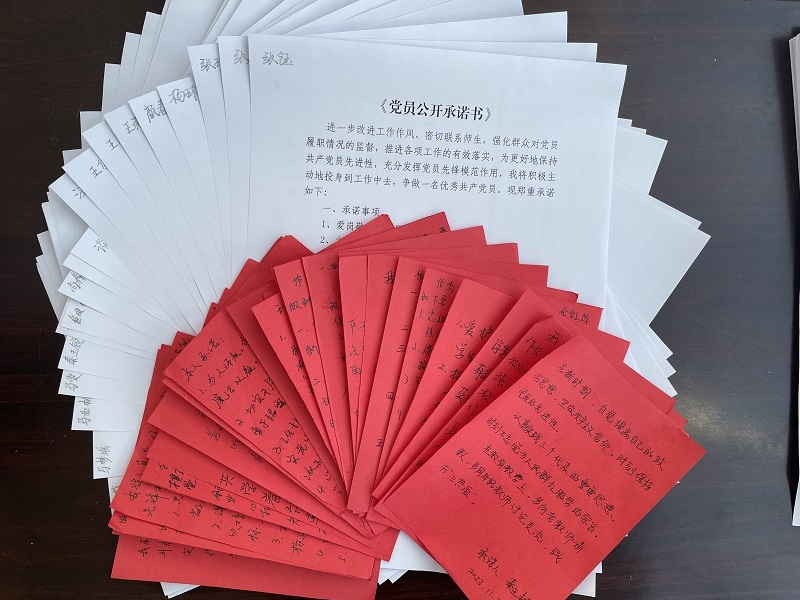 活动伊始,所有党员认真学习了习近平总书记在中央学习贯彻习近平新时代中国特色社会主义思想主题教育第一批总结暨第二批部署会议上的讲话;《习近平著作选读》第一卷部分章节以及习近平总书记在广东考察时重点对“以学铸魂”提出的明确要求,强调“坚定理想信念”“铸牢对党忠诚”“站稳人民立场”等相关讲话材料。全体党员深刻领会了会议精神,由每名党员结合自身工作、学习、生活实际,提出个人承诺践诺内容,由各支委会对党员提出的承诺践诺事项进行审核,党员做进一步修改完善,最后将承诺事项形成体现于“党员公开承诺书”,并由党员本人签名。