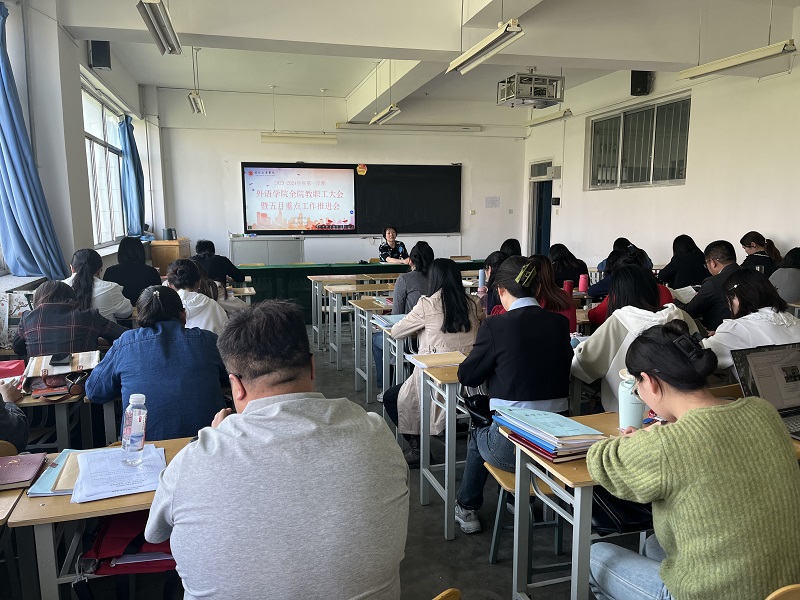 5月9日,外语学院在4号教学楼409教室召开全体教职工大会,就3-4月我院重点工作开展情况进行通报,并对我院下一步工作计划进行详细安排布署。教学副院长詹秀伟、办公室主任魏巍及全体教职工参加本次会议,会议由教学院长助理袁枫茸主持。