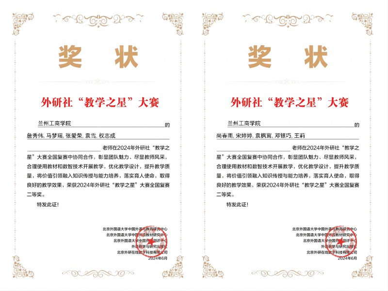在此次大赛中,我校外语学院英语类专业组(詹秀伟、马梦瑶、张爱荣、袁雪、权志成)及大学英语组(尚春雨、宋婷婷、袁枫茸、邓银巧、王莉)两支参赛团队均以出色的表现斩获全国复赛二等奖。