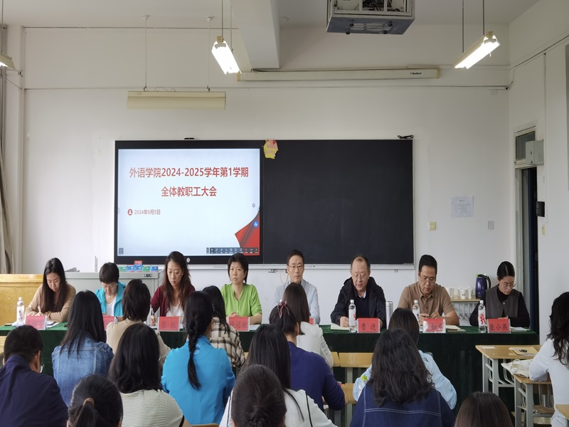 2024 年 9 月 6 日,外语学院在明辨楼409召开新学期工作部署推进会。会议由学院党总支书记张钰主持,学院全体教师参会,会议同时邀请学校教学常务副校长宿光平以及副校长徐运敏出席。