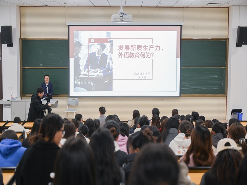 11月22日,北京语言大学国际语言服务研究院院长、高级翻译学院博士生导师、国家语言服务出口基地首席专家王立非教授为我院师生带来了一场题为“发展新质生产力,外语教育何为?”的学术报告。报告会由教学副院长詹秀伟主持。