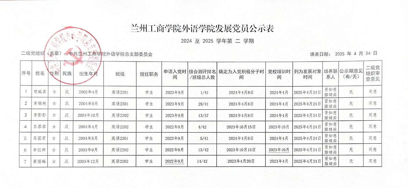 兰州工商学院外语学院发展党员公示