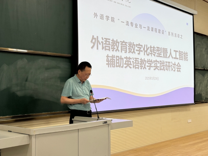 为推动外语教育数字化转型升级,探索人工智能赋能外语教学创新路径,5月29日下午,由外语学院主办的“外语教育数字化转型暨人工智能辅助英语教学实践研讨会”在综合教学楼603教室成功举办。此次研讨会由外语学院教学院长王谋清教授主持。外语学院领导班子、全体教师及我院学生代表与省内外教育领域专家学者、行业领军企业代表齐聚一堂,共商外语教育改革新方向。