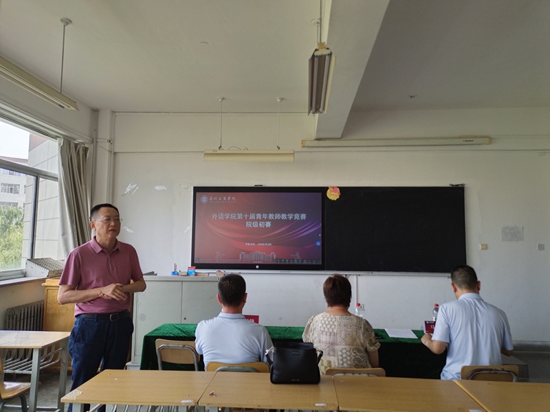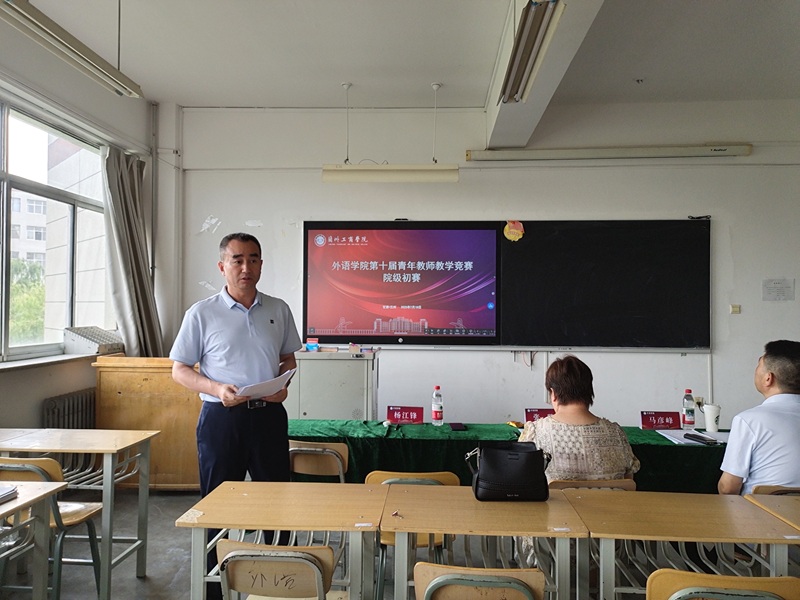 为落实“立德树人”根本任务,深化教育教学改革,助力青年教师成长成才,7月18日下午,外语学院在明辨楼409教室举办第十届青年教师教学竞赛院级初赛。本次竞赛以“锤炼教学基本功,展现青年新风采”为主题,五名从各教研室选拔赛中脱颖而出的青年教师同台竞技,尽展教学风采。本次比赛由外语学院教学院长助理袁枫茸老师主持,天水师范学院外国语学院院长杨江锋教授、甘肃政法大学外国语学院院长马彦峰教授、兰州财经大学外语学院院长张璐教授受邀担任评委,学院全体教师观摩学习。
