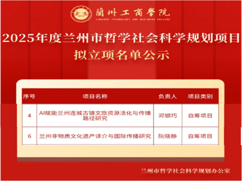 近日,2025 年度兰州市哲学社会科学规划项目立项名单揭晓,我院邓银巧、阮晓静两位老师主持的课题成功入选,特此祝贺!