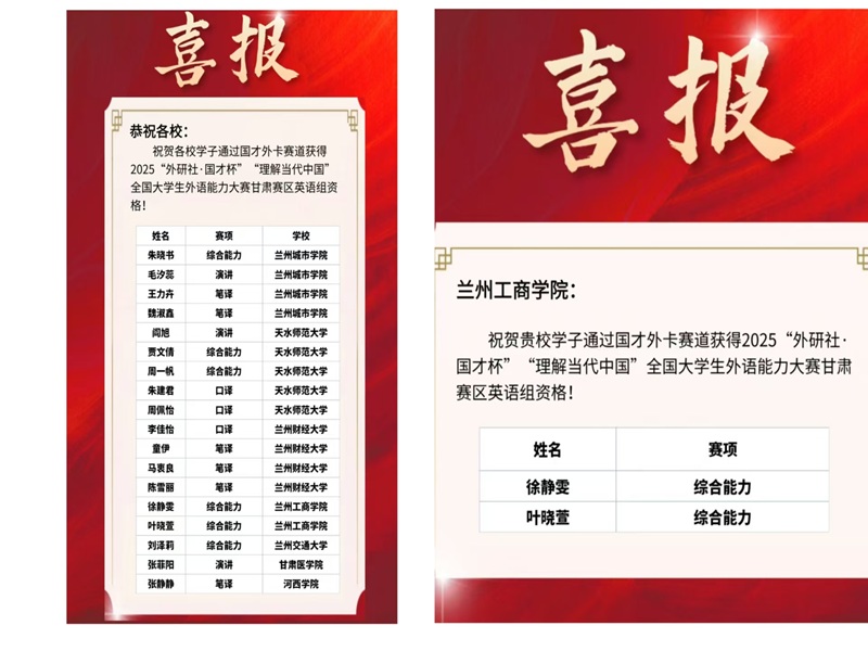 近日,兰州工商学院外语学院学子徐静雯、叶晓萱通过国才外卡赛道,成功获得该赛事英语组比赛资格,直接晋级甘肃赛区复赛,为学院和学校增添了新的光彩。