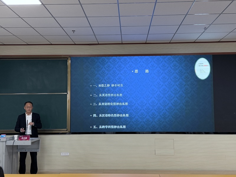 接着黄教授从英汉对比的角度,引领在场师生从单语到双语,从语言到文化,从外文到人文社科,到自然科学的转变,从中不断地悟出“私”想,以助自己成为“气自华”的外语人。