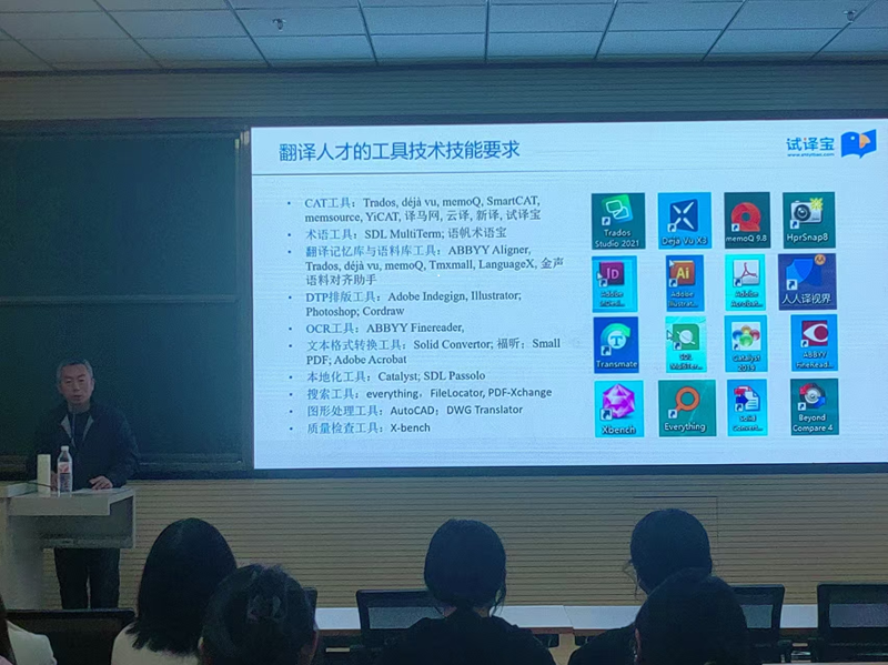 在技术技能要求方面,师建胜详细列举了翻译人才需掌握的工具矩阵,涵盖CAT工具(Trados、memoQ等)、术语工具(SDL MultiTerm等)、DTP排版工具(Adobe系列)等十余类专业工具。他强调,AI时代的外语人才不能仅停留在语言能力层面,还需成为“技术娴熟的语言服务者”,熟练运用这些工具是提升职场竞争力的关键。同时,他还提出职场工作必备技能的“四维模型”,从基础办公软件规范到AI智能插件应用,再到敏感文件加密保护,全方位构建学生的职业技能体系。