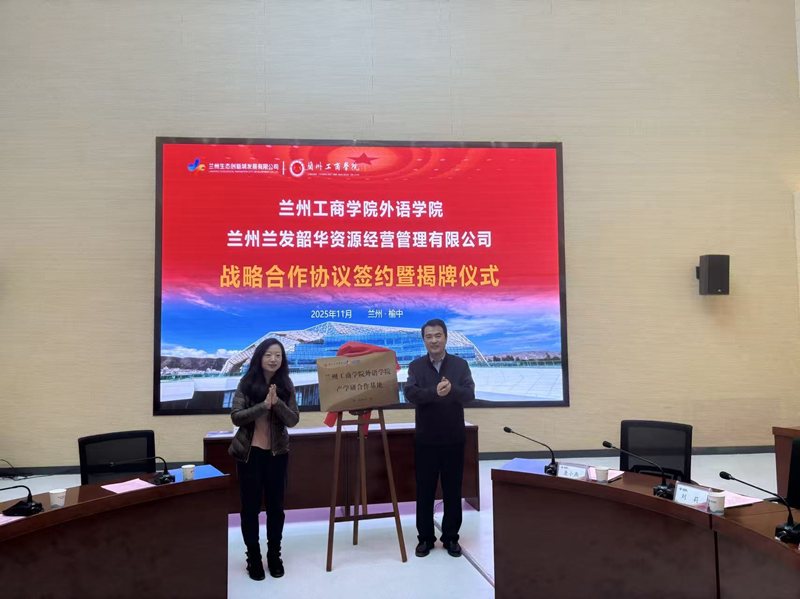 郇东书记与祝青总经理共同为“兰州工商学院外语学院产学研合作基地”揭牌。