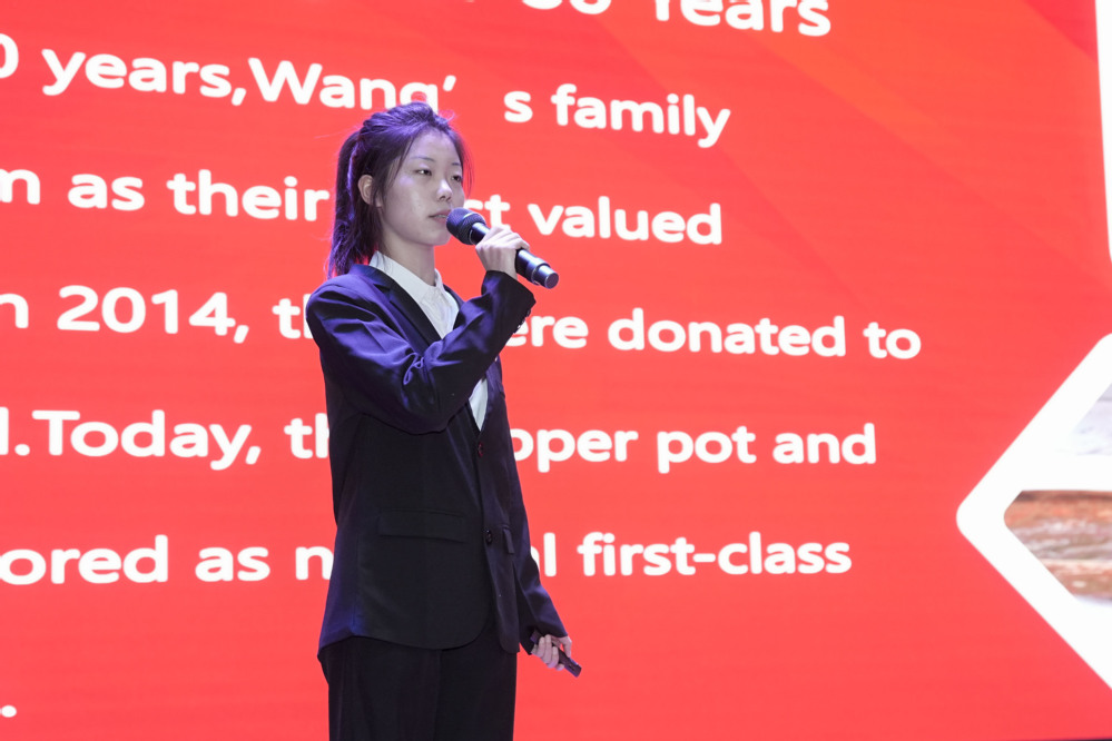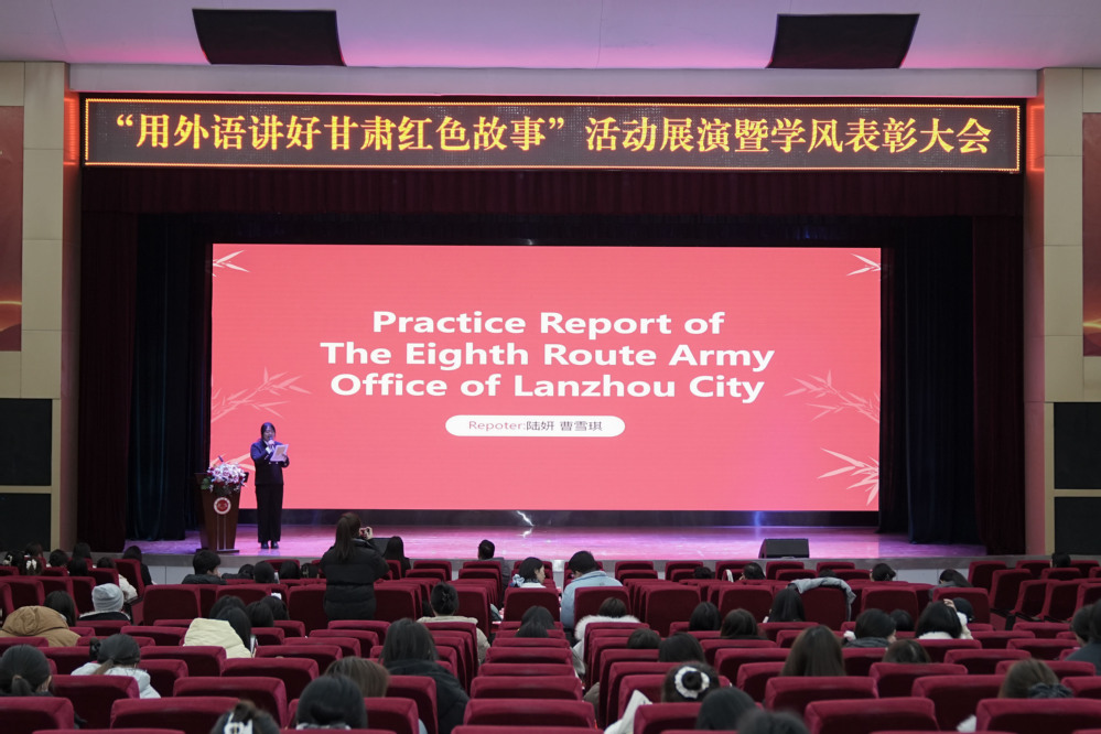 活动伊始,七组学生代表依次登台,以流利英语生动再现兰州八办的峥嵘岁月、会宁会师的历史丰碑、榜罗镇会议的战略抉择等甘肃红色地标背后的革命故事,将南梁精神、长征精神通过跨语言传播方式娓娓道来。庄重热烈的展演氛围,不仅展现了学子们扎实的专业素养,更让红色基因在语言传递中浸润心灵,有效增强了师生的文化自信与民族自豪感。