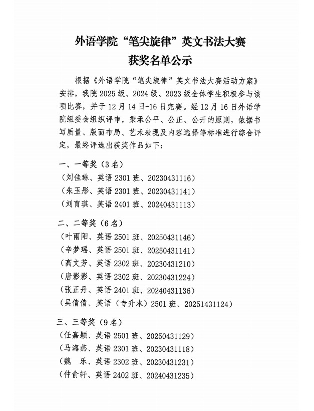 外语学院“笔尖旋律”英文书法大赛获奖名单公示