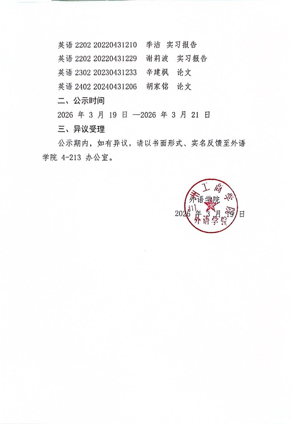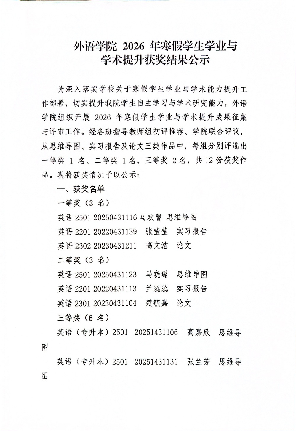 外语学院2026年寒假学生学业与学术能力提升获奖结果公示