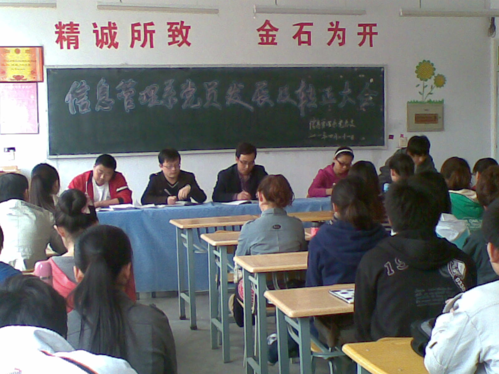 4月21日12:00,在善问楼308教室举行本学期第一批党员发展暨转正大会,讨论了刘岗等4位同志的发展问题和李涛等9名同志的转正问题。出席会议的有系党总支书记,学生一、二支部书记及支部副书记,学生党员52人,有表决权的正式党员16人。会议由学生第二党支部副书记王恒同学主持。