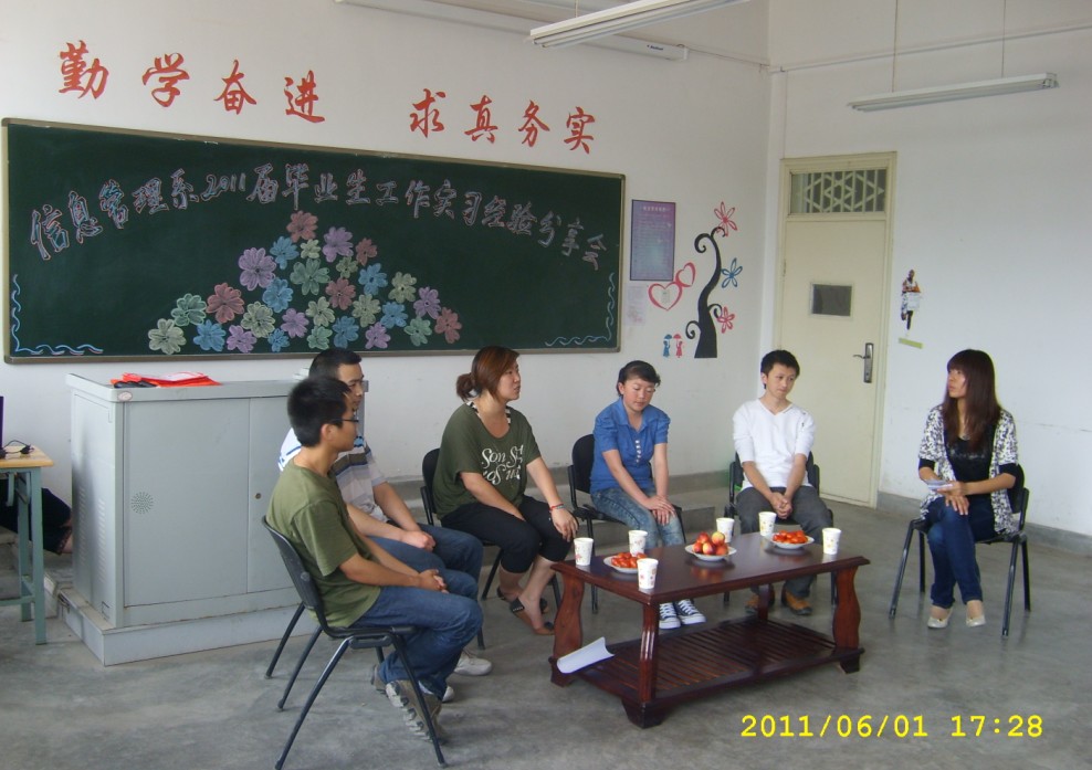 201161下午430,在2号教学楼302教室举行信息管理系2011届毕业生工作实习经验分享会,参加本次分享会的嘉宾有招生就业处张春燕处长,信息管理系常雪琴主任,党总支书记张计强老师,教学副主任于泳海老师以及夏雪等5名优秀实习生,本次分享会由刘海娟老师主持。