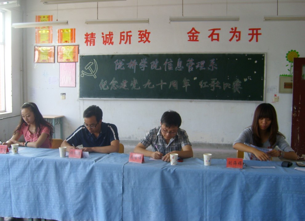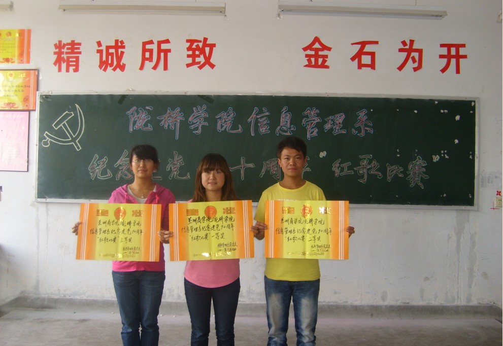 本次班级歌咏比赛有一至三年级八个班级199人参加,歌唱了《没有共产党就没有新中国》、《毛委员和我们在一起》等经典爱国主义歌曲。经过慷慨激昂的演唱,评委老师的点评,最终2009级网络工程班获得第一名,2009信本班获得第二名、2009计本班获得第三名,2010级信本合班获得优秀组织奖。