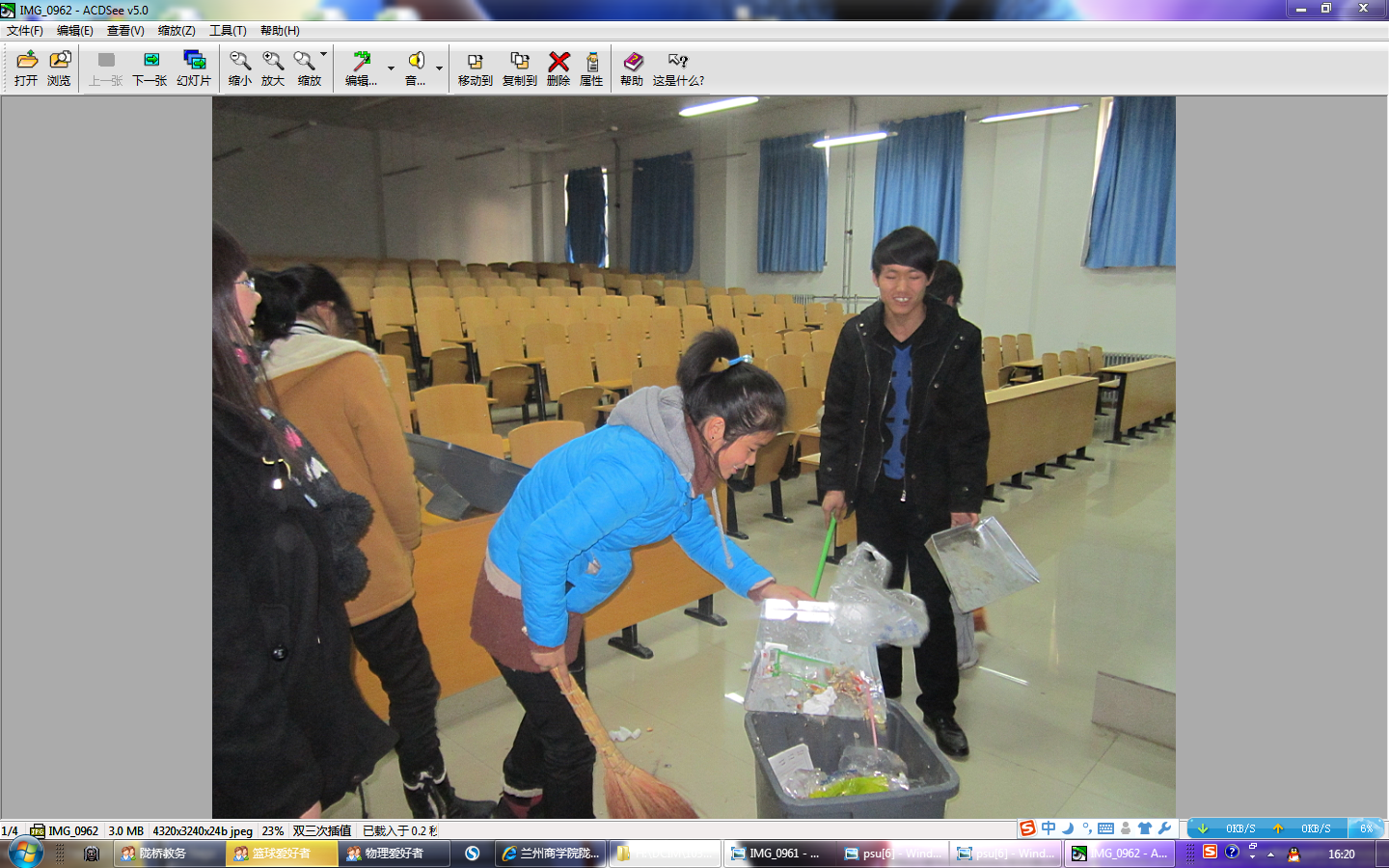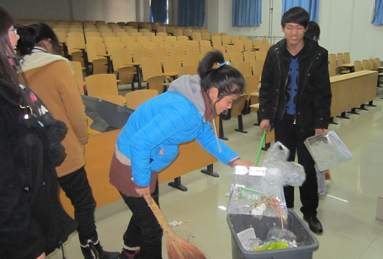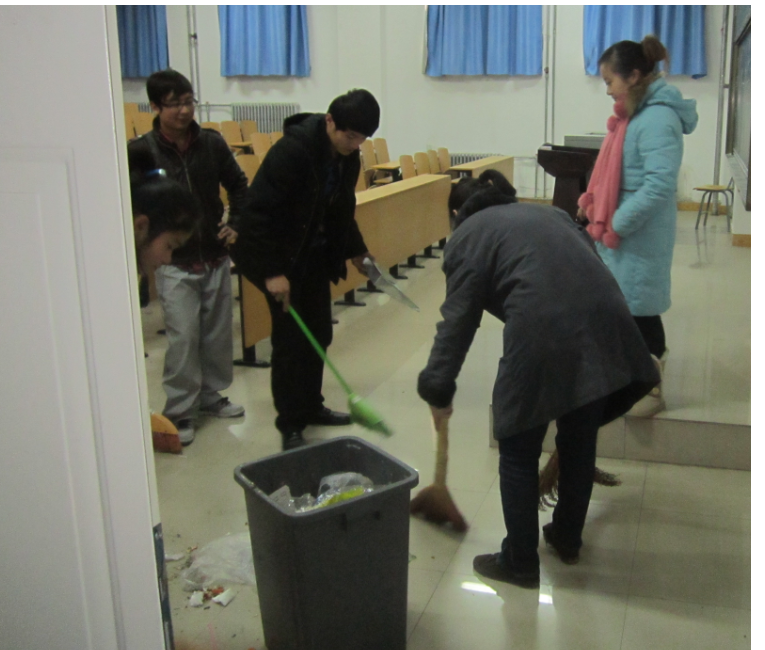 为了进一步发挥大学生党员的先锋模范作用,12月20日下午四点半,我系的二十七名新发展的党员在学生支部书记的带领下开展了义务打扫实验楼活动。对实验楼一楼阶梯教室里的垃圾进行了清扫。虽然天气寒冷,但是学生党员们依然干得热火朝天,这次活动受到了电教中心和我系领导的好评及周围同学的一致赞誉。