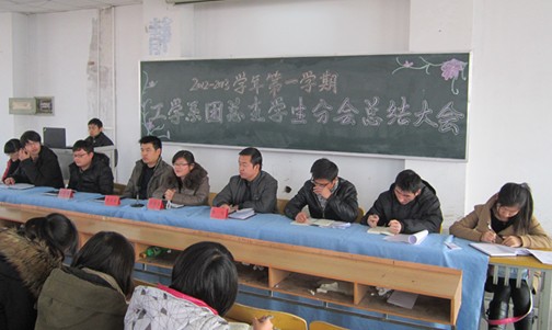 12月27日中午,我系2012-2013学年第一学期团总支学生分会工作总结大会在善文楼315教室召开。我系党总支书记常雪琴副教授、党总支副书记兼行政副主任李号龙老师、系团总支书记张希伟老师、党政秘书兼辅导员尚飞老师、团总支学生分会学生干部共100多人参加了会议,会议由团总支副书记张菁华同学主持。