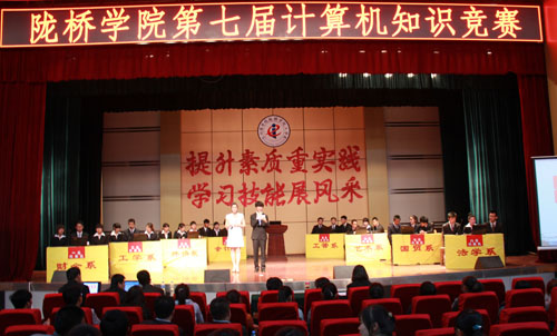 为了深入贯彻落实《学院创新创业教育计划实施办法》,激发同学们学习计算机相关知识和技能的兴趣。4月2日下午,由学院团委主办、工学系团总支学生分会承办、学院计算机协会协办的以“提升素质重实践,学习技能展风采”为主题的陇桥学院第七届计算机知识竞赛在学术报告厅隆重举行。学院学生处处长兼团委书记郇东老师、学院团委副书记张勇老师、学生管理科副科长刘灿帅老师、党委工作部关小强老师以及各系党总支书记、副书记、团总支书记出席了活动,全院各系800余名学生代表参加了本次活动。
