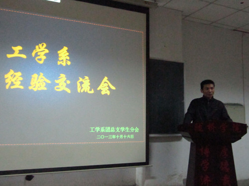 10月18日晚8时,我系在善问楼315教室举行学习经验交流会。系主任于泳海副教授,党总支副书记刘灿帅老师,教学副主任田伟老师、系团总支书记张希伟老师、党政秘书兼辅导员牛应才老师、辅导员陈玉龙老师、教学秘书李璟荣老师出席了大会,高年级获得国家奖学金、国家励志奖学金、省级三好学生、部分学院奖学金获得者及优秀学生干部代表共计8名同学做了学习经验介绍,本次学习经验交流会利用10月17日、18日晚两天晚自习时间,分两场进行。参加学生是2013级全体学生,本次活动旨在通过高年级优秀学生学习经验的介绍,提高一年级学生的学习兴趣,树立自信,确定自己的学习目标,营造良好的学习氛围。