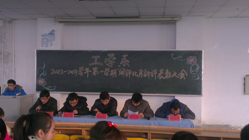 12月24日下午4:30,我系2013—2014学年第一学期12月份“周评比,月讲评”班级考核总结暨表彰大会在善问楼315教室举行,党总支副书记刘灿帅老师,行政副主任李号龙老师,党政秘书牛应才老师、辅导员陈玉龙老师及系团总支学生分会全体成员及各班学生代表参加了大会。会议由团总支书记张希伟老师主持。