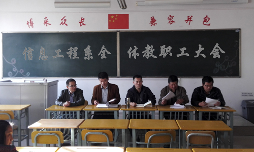 1022日下午,信息工程系在实验楼305教室召开了全体教职工大会。我系主任孙力、党总支书记刘灿帅、副主任田伟、副主任叶得学、设备总工程师徐全德及教研室主任、任课教师、辅导员等全体教职工参加了此次大会,会议由孙力主任主持。
