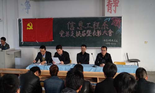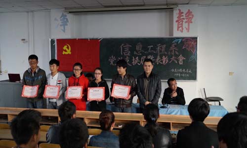 10月29日下午,我系在博学楼315教室召开了2013-2014学年党总支换届暨先进表彰大会,信息工程系主任孙力、党总支书记刘灿帅、团总支书记牛应才以及全系学生党员共计200人参加了此次大会,会议由党政秘书邓超主持。