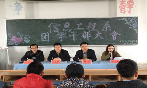为及时总结我系团学工作,并就下一步重点工作做好部署和安排,争创我系团学工作的新局面。信息工程系团总支于4月9日中午12:15在1号楼315教室召开了全体团学干部大会,参加本次会议的老师和同学有系党总支书记刘灿帅、全体辅导员老师、团总支学生分会成员及各班班委。会议由团总支书记牛应才主持。 大会在庄严的国歌声中拉开了序幕,本次团学大会首先对我系上学期各类团学活动中表现突出的个人、优秀学生干部及先进班集体进行了表彰奖励。接着牛应才老师对上学期系团总支在学生干部管理、学生干部思想教育及各类团学活动做了总结,同时对本学期团学工作做了详细安排,并对全体团学学生干部提出如下要求:一是刻苦学习,学生干部必须勤奋努力,上课时认真听讲,做好笔记,养成良好的学习习惯,在班级中起到带头作用。二是思想方面,必须树立良好的世界观、价值观,人生观,珍惜时间,积极主动参加各项活动,努力锻炼自己。 三是工作方面,在工作中要认真负责,脚踏实地,勤勤恳恳,绝不放过任何一个细节,全面提高自身的综合能力。 最后,系党总支书记刘灿帅做了总结讲话,重点在四个方面做了明确的要求:一是对上学期我系在团学工作中取得的成绩给予充分肯定,对在团学工作中付出大量汗水的学生干部和班级表示衷心的感谢,要求获奖学生和获奖班级戒骄戒躁、积极进取,争取在以后取得更好的成绩;二是对运动会的开幕式表演,方阵训练提出严格要求,希望全体同学认真对待,积极主动准时参加训练;三是对运动会的前期准备、运动员的训练,尤其是安全方面做了要求,务必在安全前提下组织训练,安全使用标枪、铅球等较危险的训练器材,科学训练,谨防拉伤等意外发生,同时,团学干部要做好考勤及服务保障工作;四是对全体同学,尤其是重点强调了团学干部要加强学习,在学习上起到带头模范作用,学好专业技能,全面提高自己。