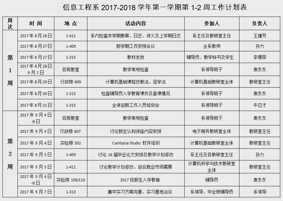 信息工程系2017-2018学年第一学期第1-2周工作计划