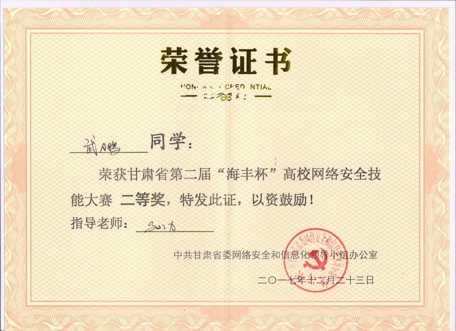 2017年12月23日,由中共甘肃省委网络安全和信息化领导小组办公室、甘肃省工业和信息化委员会、中国信息产业商会信息安全产业分会主办的甘肃省第二届“海丰杯”高校网络安全技能大赛在甘肃政法学院成功举办。
