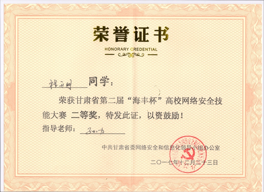 经过四小时的激烈对决,由我系鲜宏博、程开明、武鹏3名同学组建的ROOT队发挥出色获得本次比赛“二等奖”,仅次于兰州大学1nv0ker队和甘肃政法学院和谐网安队,为我院争得了荣誉。这是我院代表队继首届比赛获得“三等奖”后又取得的一次好成绩,这也是我院不断提高教育教学水平,实施创新创业教育,加强实践能力培养的有力体现。